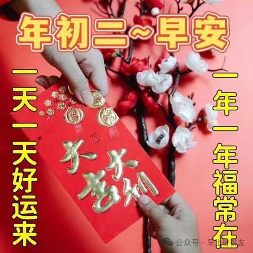 正月初二,问候声。充满祝福和喜悦。财源广进,财富丰收。家庭幸福,苦恼远离。光明的未来和丰厚的收入。事业发达,官运亨通。天气好,收获满满。一切顺利,生活舒适。