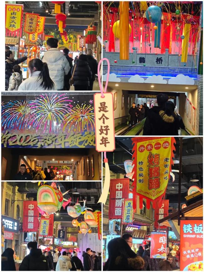灯笼高挂,美食芬芳,迎新氛围浓厚。一楼的美食摊前,人流不断,有的市民和游客带着孩子结婚,有的朋友聚在一起吃饭玩乐,烟火气浓浓。