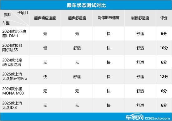帕萨特是后续状态检测中唯一的一种。 Pro 一个模型得了满分。相对而言,2024 极狐阿尔法 阿尔法(以下简称阿尔法) S5)只是在起步响应速度上略有失分,整体性能显著。另外,四款车的问题主要是不支持自动跟车的起步功能,所以在起步响应速度和舒适度上没有取得成绩。
