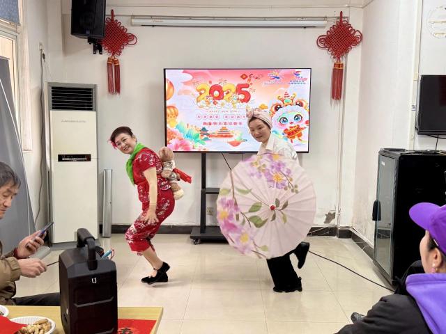 佳翔苑活动室盛大上演了一场精彩的迎春文艺演出,充满了浓厚的节日气氛。许多观众聚集在一起迎接春节的到来。活动在欢快的开场舞中拉开帷幕。舞者们穿着色彩鲜艳、富有传统魅力的服装,用灵动的舞蹈展现出对新年的美好期待,瞬间点燃了现场的热烈氛围。吹风机演奏选取了两首经典曲目——《我们的生活充满阳光》和《北国之春》。现场气氛有时欢快,有时宁静而遥远。观众仿佛经历了一次情感旅行,从充满阳光的生活画轴,到充满深情的北方春天意境。