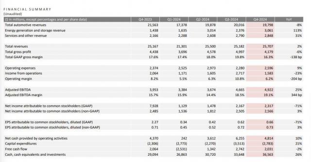 公司表示,第四季度降低成本的幅度并没有原来想象的那么大,这与生产线的问题有关。新车计划,包括更便宜的车型,仍然有望 2025 2008年上半年开始生产,无人出租车 Cybercab 计划 2026 年度投产,预计将于今年晚些时候在美国部分地区开始推出“其无人驾驶约车业务”。