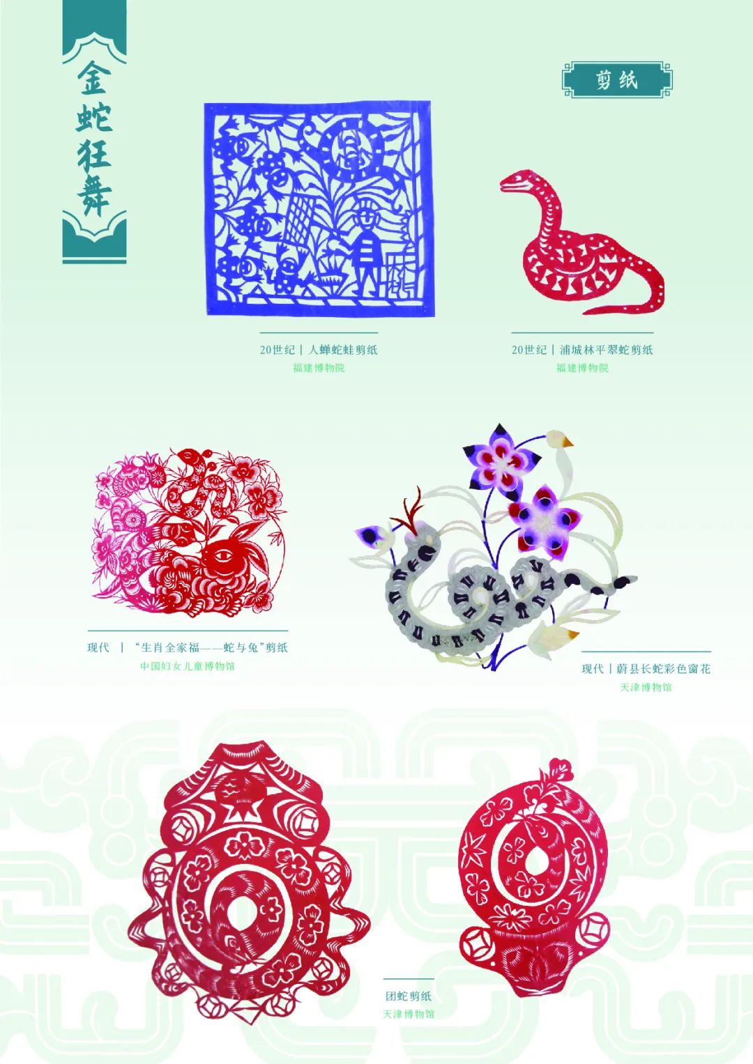 从古代祖先对蛇的恐惧,到蛇神、祖先、生殖崇拜的神化和高贵,蛇的灵瑞、吉祥和财富也在民俗中广为人知。民间故事中有许多关于灵蛇报恩、人蛇相恋的传说,从侧面反映了古代的“天人合一”、人类与自然和谐相处的哲学理念。与此同时,蛇形象往往因其灵活灵动的姿态,出现在剪纸、刺绣等工艺美术作品中,寄托着人们对美好生活的许多愿望。蛇,带着生命的坚韧和永恒的希望,深深植根于每一个中国孩子的心中,成为中华文化中不朽的亮色。