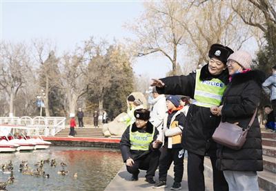 一位带孩子的市民说,春节期间带孩子出去逛公园,亲近大自然,孩子刚刚经历了喂鸭子,感觉很有意思。一些警察正在检查,并提醒每个人随时注意安全。蓝天救援队的成员也在花园里,在这里带孩子玩感觉很舒服。