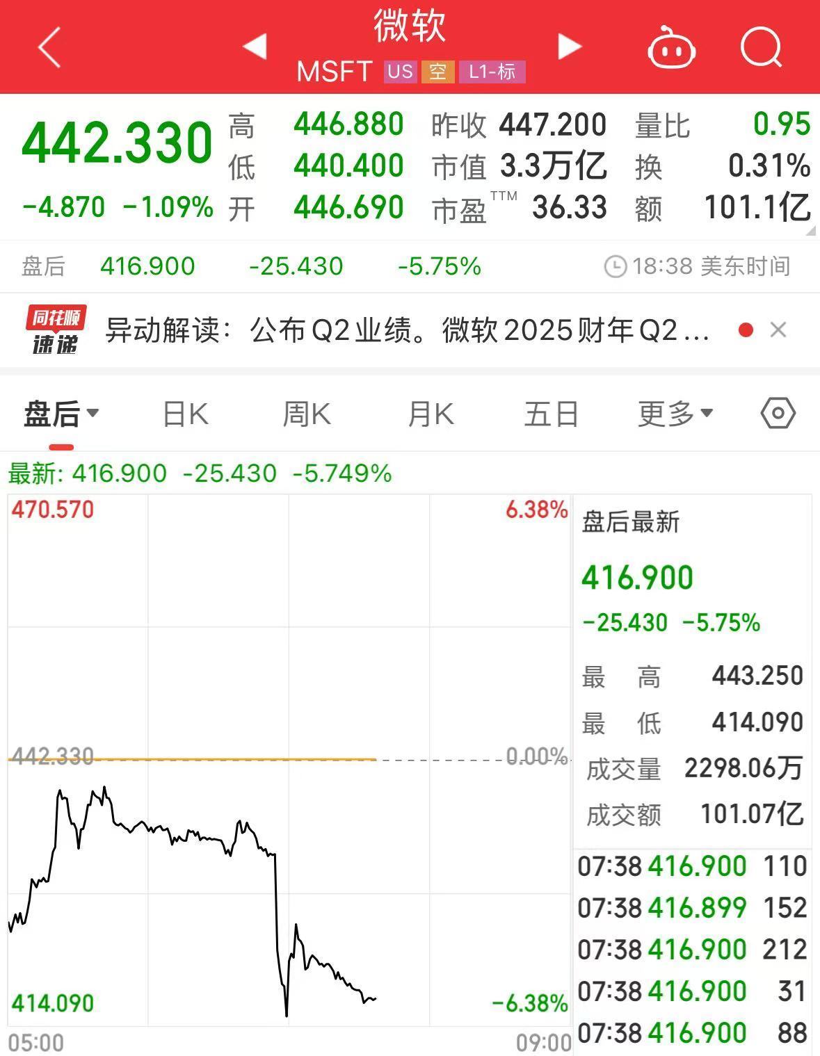 截至发稿时,微软美股盘后跌幅超过5%。