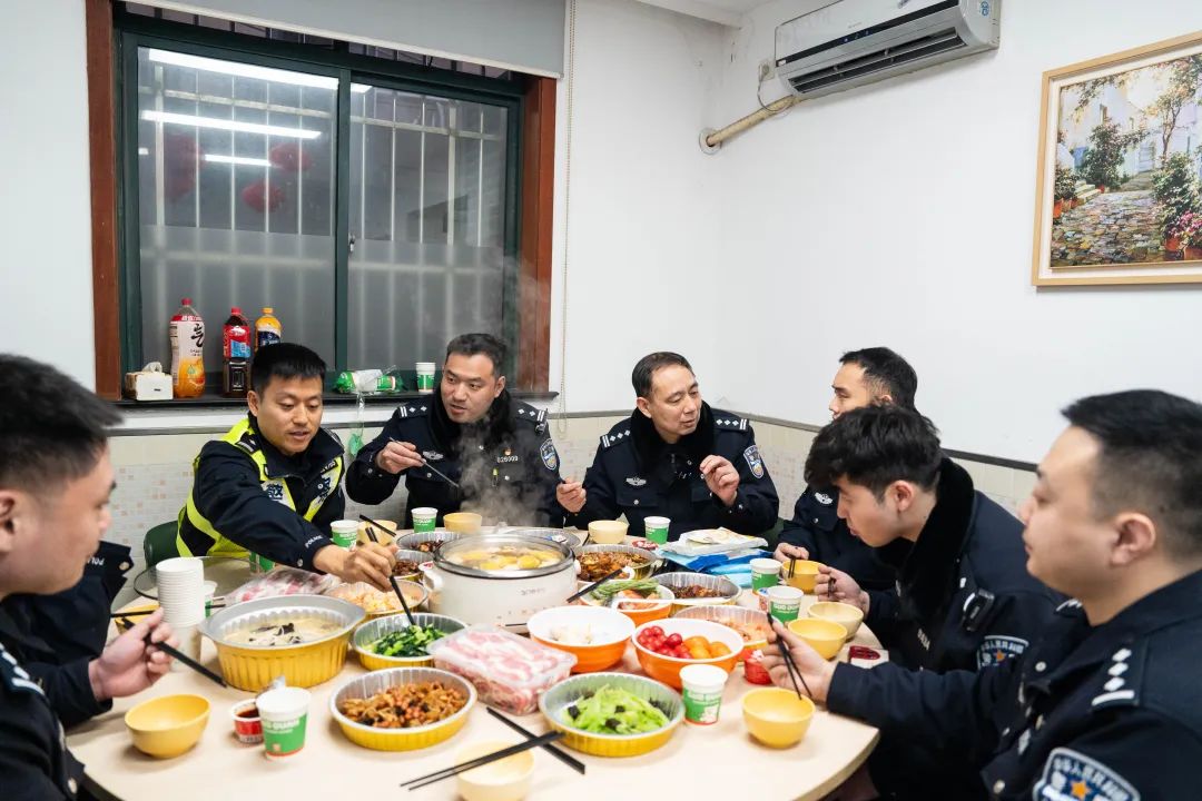 当时食堂的“团圆饭”还在继续,一个接一个的警察起身出去上班,一个接一个的警察从岗位上回来坐着吃饭。在这个家家户户团聚守岁的夜晚,仙霞路派出所像往常一样明亮,直到深夜...