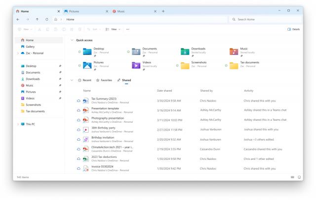如图所示,文件资源管理器现在增强了快速访问共享文档的功能。您可以启动文件资源管理器首页,点击“共享”选项卡访问此功能。