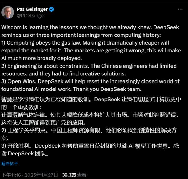 快科技 1 月 29 日消息,英特尔前 CEO 帕特 · 基辛格(Pat Gelsinger)日前在社交平台发帖,高度赞赏开源。 AI 推理模型 DeepSeek。