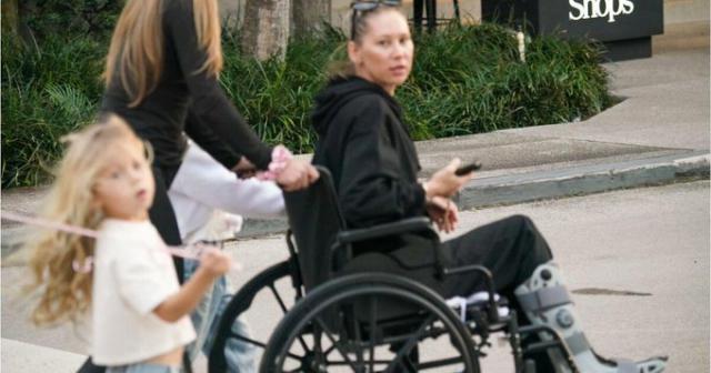 过去网球女神购物中心遭遇偶遇,却戴着脚踝护具坐轮椅出现