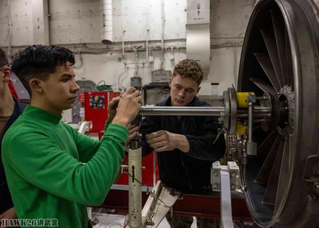 事实上,保持一艘航空母舰的正常战备水平是飞行甲板下最重要的。两名机械师正在修理。 F-414 涡轮机风扇发动机, F/A-18E/F 舰载战斗机“超级大黄蜂”的标准配置。