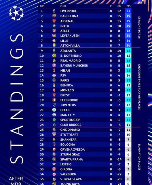 这个赛季欧冠已经进行了改革,参赛队伍正式改为 36 球队,小组赛的比赛也变成了联赛阶段; 8 竞争轮;利物浦、巴萨、阿森纳、国际米兰、马竞、勒沃库森、里尔和维拉分列积分榜。 1-8 位置;无需参加附加赛,直接晋级淘汰赛。