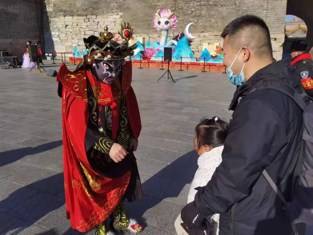 大年初一早上,居庸关长城景区热闹非凡,川剧变脸民间表演正在进行中。演员穿着华丽的戏服,在舞台上翩翩起舞。一瞬间,他轻轻一挥袖子,脸上的脸书瞬间变了,红、蓝、白、黑...各种颜色的脸书交替出现,令人眼花缭乱。随后,演员走进观众平台,在与观众互动的同时,迅速改变了脸书,吸引了观众的惊叹。