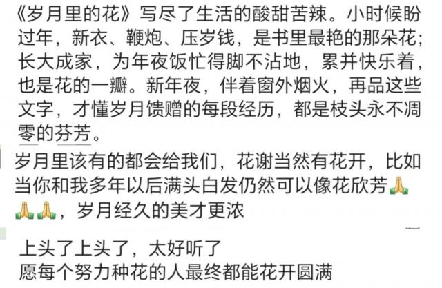 "岁月里的花儿在单曲中循环了很长时间,的确抚慰了我在感情中经常出现的困难和困惑"