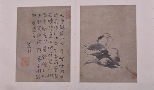 在朱耷的《八哥诗画页》中,两个八哥以闭眼缩颈缩肩的姿态呈现,仿佛在体验生活的苦与酸。从朱耷的名字来看,如果把“牛耳”这个词拆开,剩下的部分就是“八大”,这也是他比较熟悉的别号“八大山人”。八大山人的题型多变,时而像“哭”,时而像“笑”,让人回味无穷。