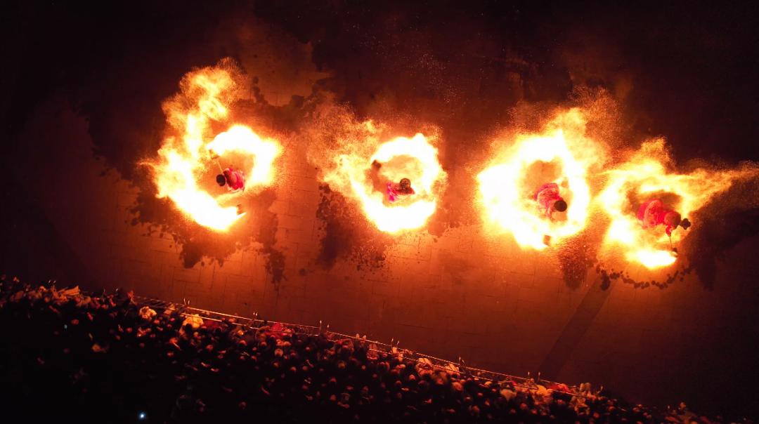 晚上7点,在牡丹广场,吐火、风火轮、火流星、火锅等表演充满了火花和惊心动魄的刺激。熊熊火焰照亮了夜空,演出现场人山人海,惊叹声此起彼伏。