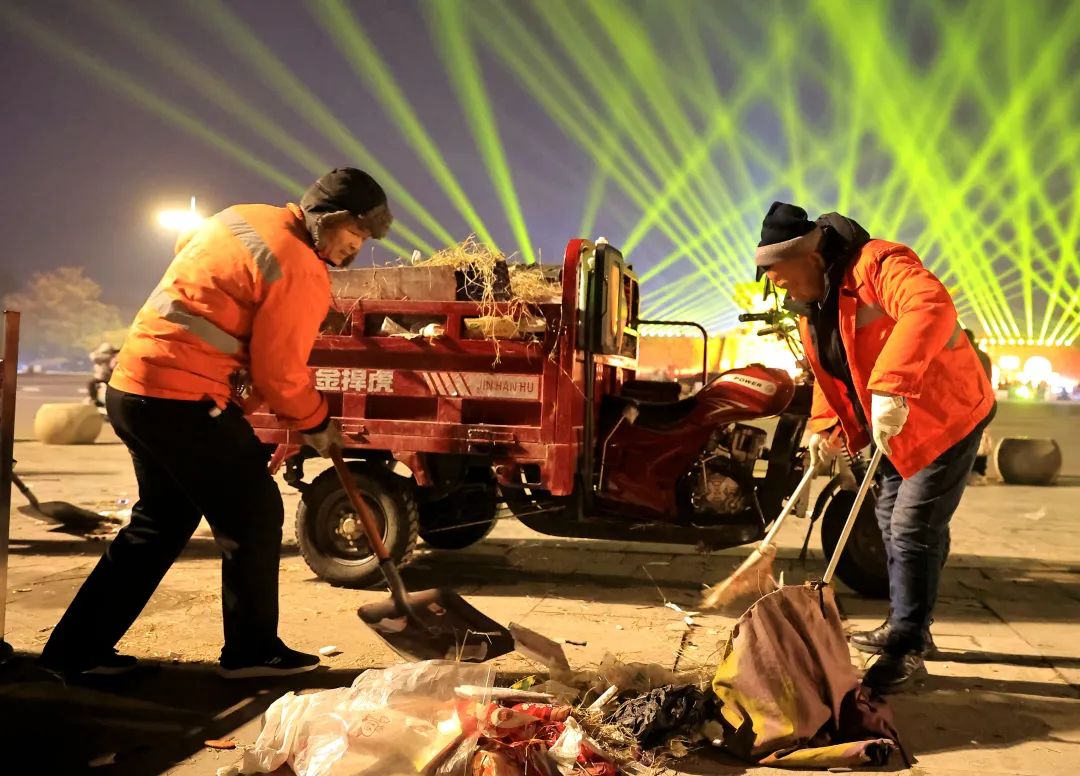 当晚,洛龙区派出了900多名环卫工人,晚会结束后立即开展清扫工作,连夜清扫收集道路和绿化带内的废物和烟花炮竹残渣,投入30多辆垃圾压缩车、垃圾收集车、清扫车等作业车辆,小型清运3轮车50辆,小型高压清洗车10辆,及时对活动场所周边路段进行深度清扫,共清理各类垃圾18吨。恢复“路面原色”约4小时,确保车辆行人通行。