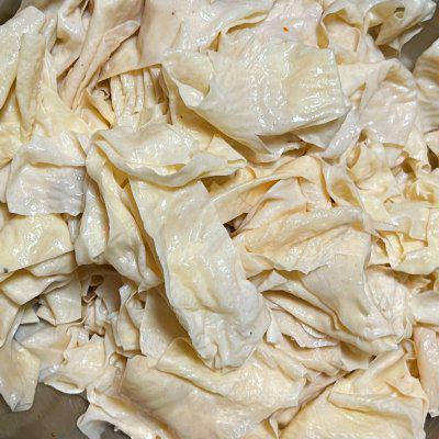 1、豆皮泡开,水烧开,放入豆皮。 30 秒捞出。