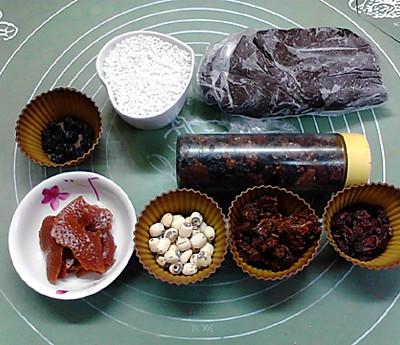 1、用料:檽米 100 克,糖渍陈皮 30 克,红糖 30 克,红豆沙 130 克,莲子 26 粒,蓝莓干 3 颗,小红枣 10 颗,蓝莓干 12 颗粒,蔓越莓干适当。