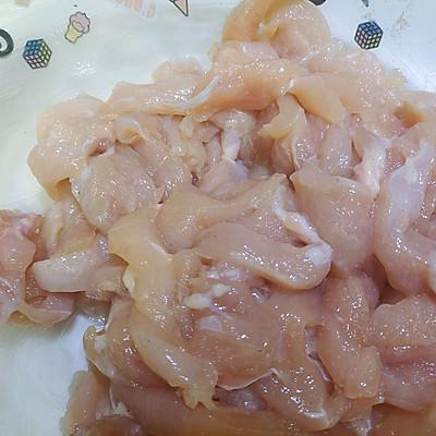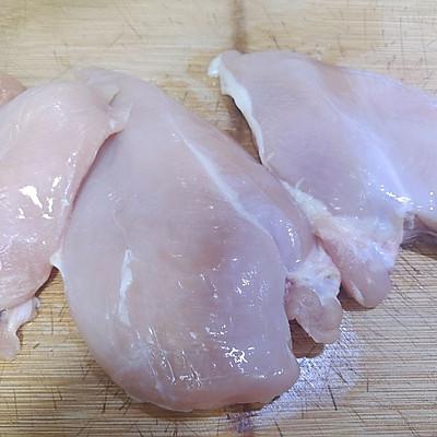2、去除多余的筋膜和肥油,将鸡胸片片成两块
