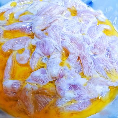 9、锅里烧油,油温五成分逐一加入鸡肉条炒熟。