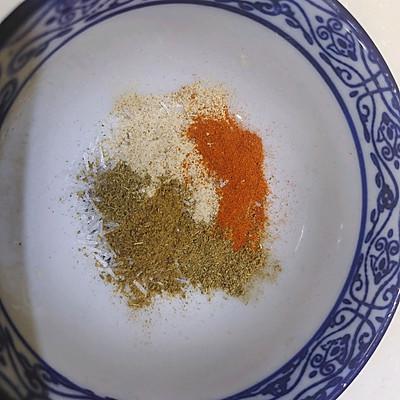 11、调整蘸粉,碗中加入盐、味精、白胡椒、细辣椒、孜然粉,拌匀即可。