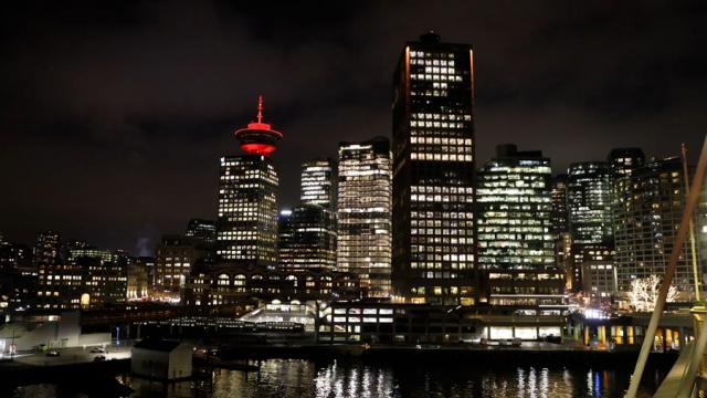 当地时间 1 月 29 当天晚上,加拿大温哥华观光塔点亮了红灯。