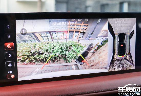 评测车配置 360 ° 全景图像,支持多角度显示。实际测量显示,在白天阳光充足的情况下,图像质量清晰,但畸变控制相当普遍,影响整体印象。图片不仅提供多个显示视角可供选择,还包含随机倒车辅助线,可供驾驶员参考,实用性极佳。