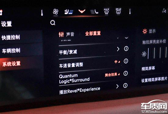 评测车配置 Revel 锐威音箱,拥有 14 一个扬声器,硬件配置不起眼。声音调节内容相当丰富,包括常规平衡器和预设的音效模式。值得一提的是,系统可以根据速度自动调节音量。
