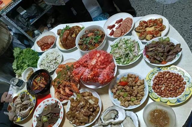 肉菜还是主角,切好的炖菜凉盘,颤抖的肘子,整只炖鸡,还有海鲜和牛羊肉,甚至拌个黄瓜加点猪头肉。