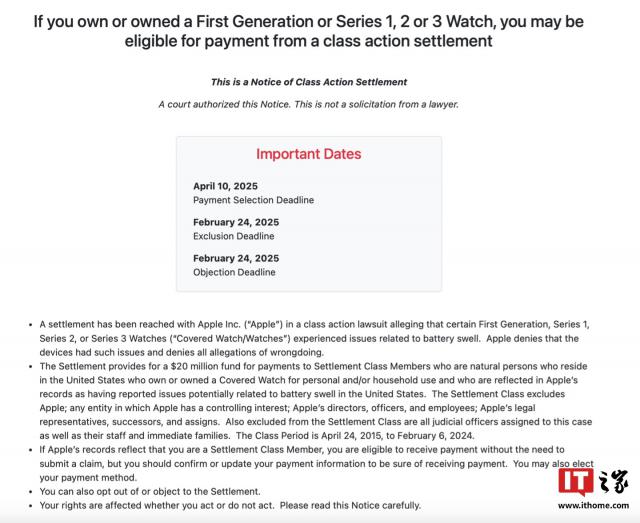 IT 世家得知,目前任何购买美版的人都知道。 Apple Watch 初代(2015 款)及 Series 1 / 2 / 3 该机型的客户可以凭借有效的购买记录在相应的集体诉讼网站(点击此处浏览)中注册信息(官方声称他们需要是生活在美国的自然人),然后他们可以获得调解赔偿(每台设备约为 20 目前的约定是美元 145 人民币)。