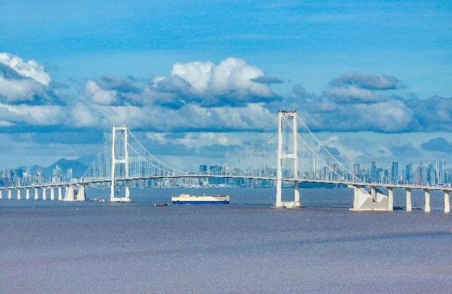 厦门海沧大桥主线总长 5926 大米,选择双向 6 车道城市主干道的标准设计是为中国自主设计和建造的。是中国第一座大型三跨全漂浮钢箱梁悬索桥。从东渡港牛头山到海沧石塘的排头门,海沧大桥在厦门西海上腾空。