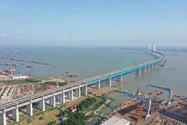 沪苏通长江大桥总长江大桥作为我国沿海铁路大通道沪苏通铁路段的跨长江控制工程, 11.07 公里集国铁、城际铁路、高速公路于一体,是目前世界上跨度最大的公铁两用斜拉桥,2020年 年 7 月 1 每天完成通车。桥梁建成通车,使张家港市彻底告别了无火车的历史,南通至上海的车程由 5 小时缩短至 1 小时左右。