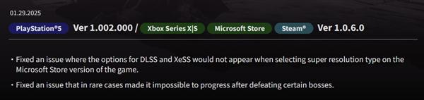 近日,开发单位发布 1.0.6.0 版本补丁,处理 XGP 版本缺失 DLSS 及 XeSS 选择问题,以及击败特定问题 Boss 之后游戏无法推广的问题。这个补丁也被分发到 PS5 平台,版本号 1.002.000: