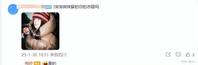 看到梅婷分享的图片后,有网友问是不是赶紧穿妈妈的衣服,梅婷说“是”。有网友直言阳阳的眼睛好大,梅婷很高兴孩子跟着大眼睛走。