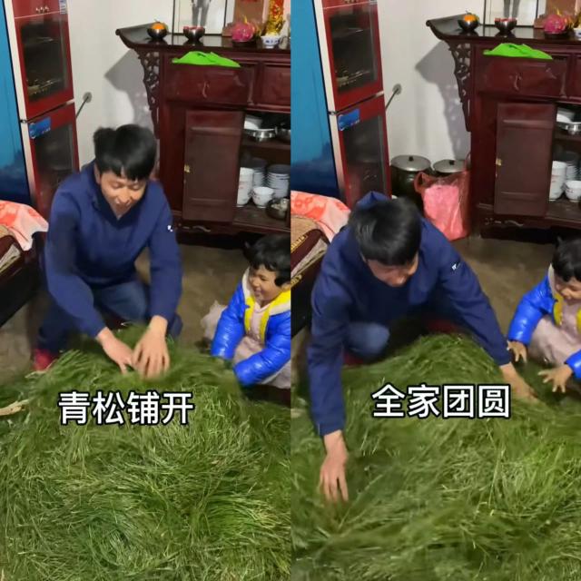大人从拿出松毛开始,嘴巴也没有闲着,顺口溜呱呱念:"青松落地,四季平安。青松铺开,全家团圆。”
