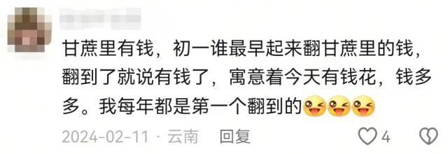 还没有结束,初一还能找到藏在甘蔗里的钱。谁先找到,就意味着新年有钱花,钱多。