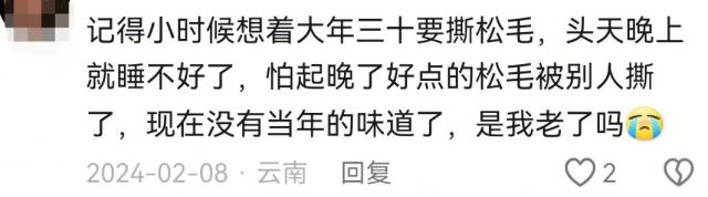 撕掉松毛,千万记得不要穿新衣服去过年,撕一身蜜油,洗不干净根本洗不干净…