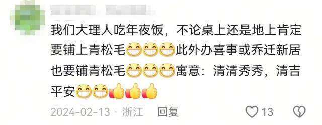 另外一种说法是,松树在彝族人眼中意味着“坚强、健康”,铺松毛象征着年轻轻松,清吉安全。后来在云南传开了,毕竟大家都想“四季常青松发大财”。