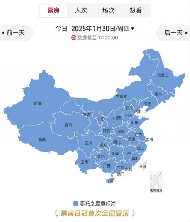 不仅如此,《哪吒》单日票房首次全国登顶,能看到各省票房第一的电影,都是《哪吒》。