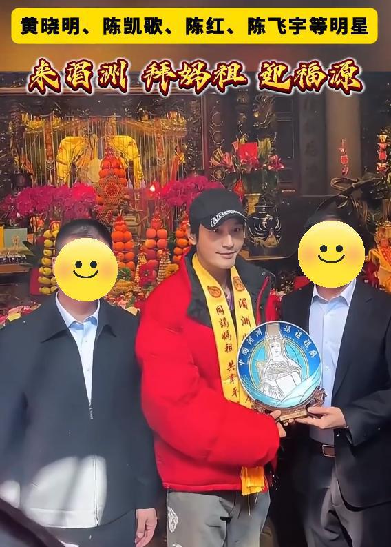 黄晓明和陈凯歌一家相约拜妈祖,红色的鞋子态度虔诚。