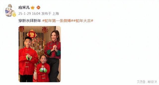 1 月 29 大年初一,应采儿在个人社交平台上与大家分享了一张与两个儿子的合照,她还高兴地写道:“穿新衣服拜新年”。