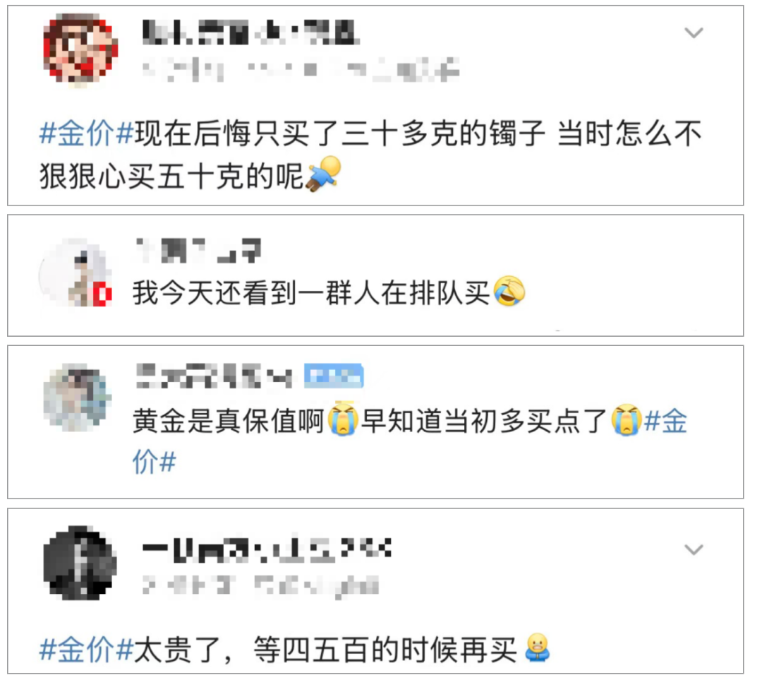 而且在社交平台上,很多网友大呼,金价涨得太快,后悔之前没有多囤点。