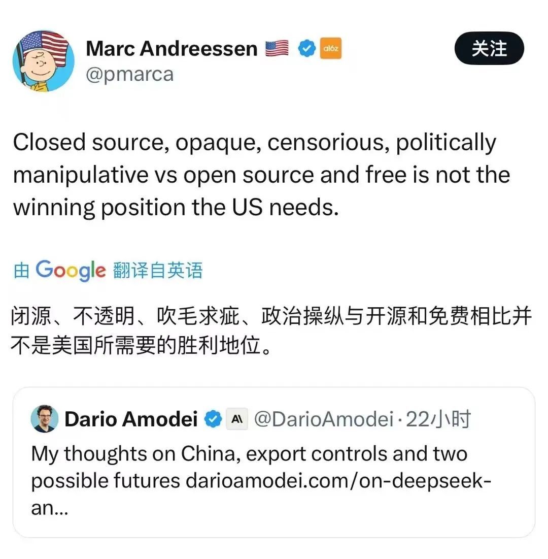 DeepSeek虽然没有直接点名,但是它以开源和免费的方式在全球AI开源社区得到了广泛的认可,而Anthropic开发的Claude模型和OpenAI的GPT模型一样,都属于闭源模型,训练过程和技术细节都不公开。Marc Andreessen的评论也在嘲讽Darioo。 Amodei,作为AI行业的领军人物,企图利用地缘政治遏制对手,否定开源工作,与实现一般人工智能目标的初衷背道而驰。