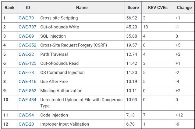 为建立今年的排名,MITRE 在分析了 31,770 个 CVE 记录中的漏洞后,每个漏洞都会根据其严重程度和频率进行评分。这些漏洞“将得益于再次投影和分析” 2023 年与 2024 年度报告,重点添加到年度报告中 CISA 利用已知漏洞的安全漏洞。 KEV 目录。