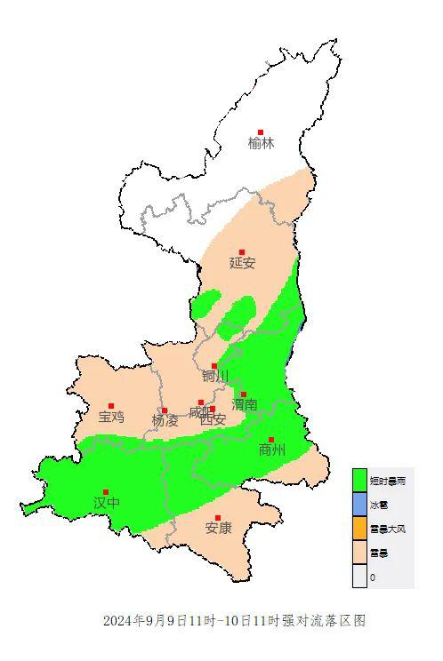 预计由于副热带高压和低层切变的影响, 9 月 9 日 11 时至 10 日 11 时(将来 24 小时),陕北省中南部、关中、陕南有雷暴天气,其中,延安南部、铜川北部和东部、渭南、宝鸡南部、西安东部和南部、汉中大部分、安康中北部和商洛大部分有短时强降水(最大小时雨强 20-40mm/h,个别点可达 60mm/h 上述),局地伴随雷暴大风(阵风 8 级以上)或冰雹等待强对流天气。这一过程具有对流性强、局部性强的特点,请相关部门对雷击、短期强降水、风雹天气带来的风险进行判断。对地质灾害进行应急防御,如强降水影响区域内涝现象、山洪、滑坡、泥石流、坍塌等。采取措施减少对学生返校、户外娱乐设施、交通运输、高空作业、电力线路、农业设施等生产生活的不良影响。根据当地政府的安排,公众应及时果断撤离,远离易发地区,如临水临崖。适当放置容易受到大风影响的户外物品,远离临时建筑、高空结构等危险位置。降水对流性强,落区不确定,邻近地区也需要高度重视,请及时关注当地气象局发布的短期临近预警信息。