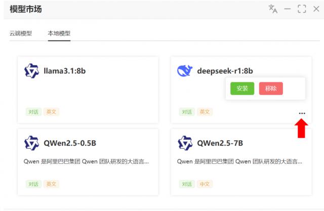 步骤三:点击“点击” ... “之后,选择“安装”,可以自动下载安装。 Deep Seek 模型。
