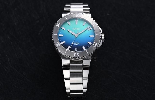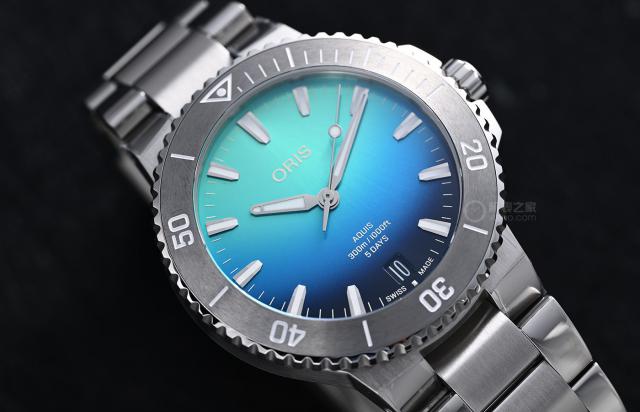 但是豪利时玩渐变是很讨巧的,能看到渐变色的独特之处。 12 点向下延伸,结合太阳辐射图案的扩散,从上到下的渐变风格也描绘了U200c的透射吸收现象,阳光透过海水。6 点位的日期窗口,也为了不损害盘面的整体美感,选择了底部的蓝色,作为同色背景。