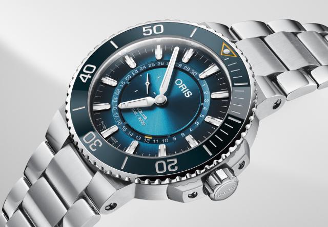 随表配有三链表带,还配有三链表带。 Oris 更换和快速调整专利表带系统。