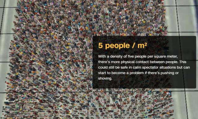 每平米 5 个体,人与人之间有肢体接触,如果每个人都保持冷静或者以稳定的秩序前进是没有问题的。但是如果有人推或者恐慌,那就很危险了。