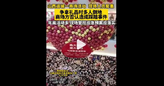 1 月初,山西一家商场搞活动,汽球里藏着礼券。为了争夺汽球,大家挤成一团,差一点造成踩踏事故。