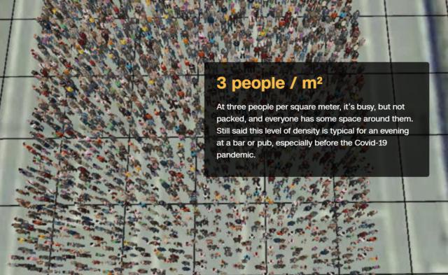 每平米 3 个体,还没有达到拥挤的水平,每个人身边都有一点空间,有点像酒吧。